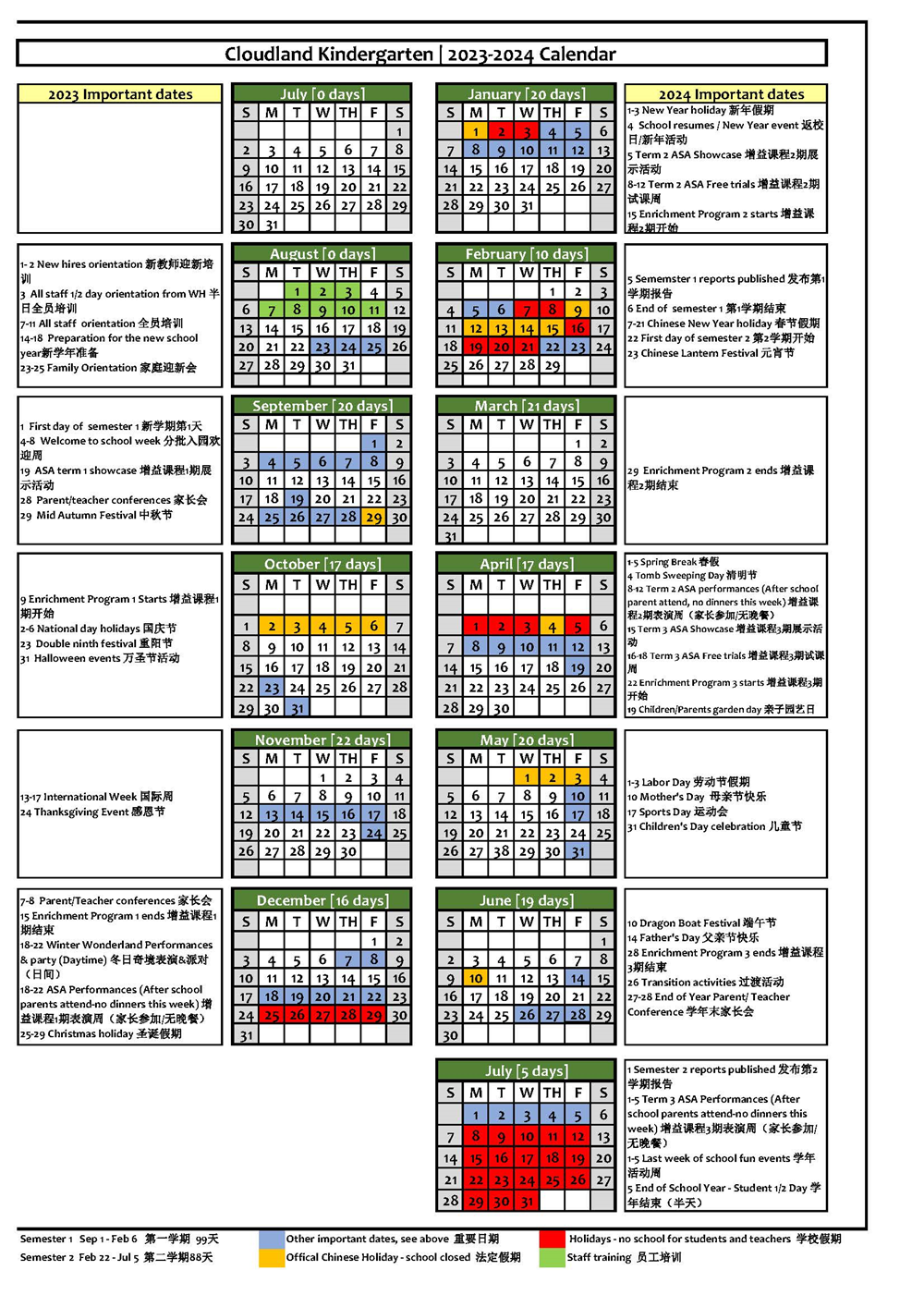 北京市朝陽區根姆贊蒂雙語幼兒園2023-2024學年(nián♠∞∏§)校(xiào)曆